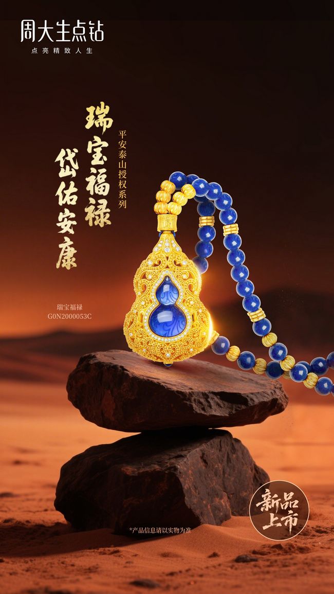会当凌绝顶,一览众山小。泰山似是天地间的脊梁,承载壮志与豪情,更百纳安宁与祥和。周大生点钻·平安泰山授权系列“瑞宝福禄”,设计灵感源自泰山三宝之一的明嘉靖·黄釉青花葫芦瓶。传统的宫廷炸珠工艺为“瑞宝福禄”带来别样的灵韵与质感。将细小金段用高温熔制成圆润饱满的金珠,再以高精仪器搂嵌加固,再通过焊接,将金珠排列组合成图案,使整体造型更加立体丰盈。同时,手工花丝与手工缂丝工艺的精妙运用,让细节之处更显典雅精致。“瑞宝福禄”承岱岳之灵气,凝华夏平安信仰,将泰山的守护之力转化为随身佩戴的平安符,护佑平安康泰。