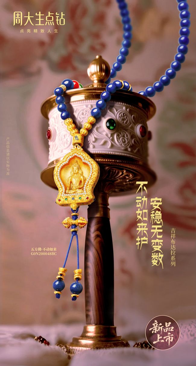 红日耀山峦,金光照大千。在雪域高原日出的金光中,希望如金辉洒满人间。周大生点钻·吉祥布达拉 系列“五方佛·不动如来”,为追求内心宁静的佩戴者,带来如佛光般恒久的力量。不动如来是五方佛中的东方佛,以其慈悲之力加持众生断除烦恼,带来内心的安静与祥和。周大生珠宝以精湛工艺为载体,将这一文化精髓融入“五方佛·不动如来”。在工艺细节上,“五方佛·不动如来”运用仿古绢画工艺,复刻绢画的细腻笔触与岁月质感,使其承载深厚的东方美学底蕴。而360°转枢工艺的加持,则增添一份动态美感,让佩戴者在举手投足间,都能感受到佛光的庇佑与祝福。