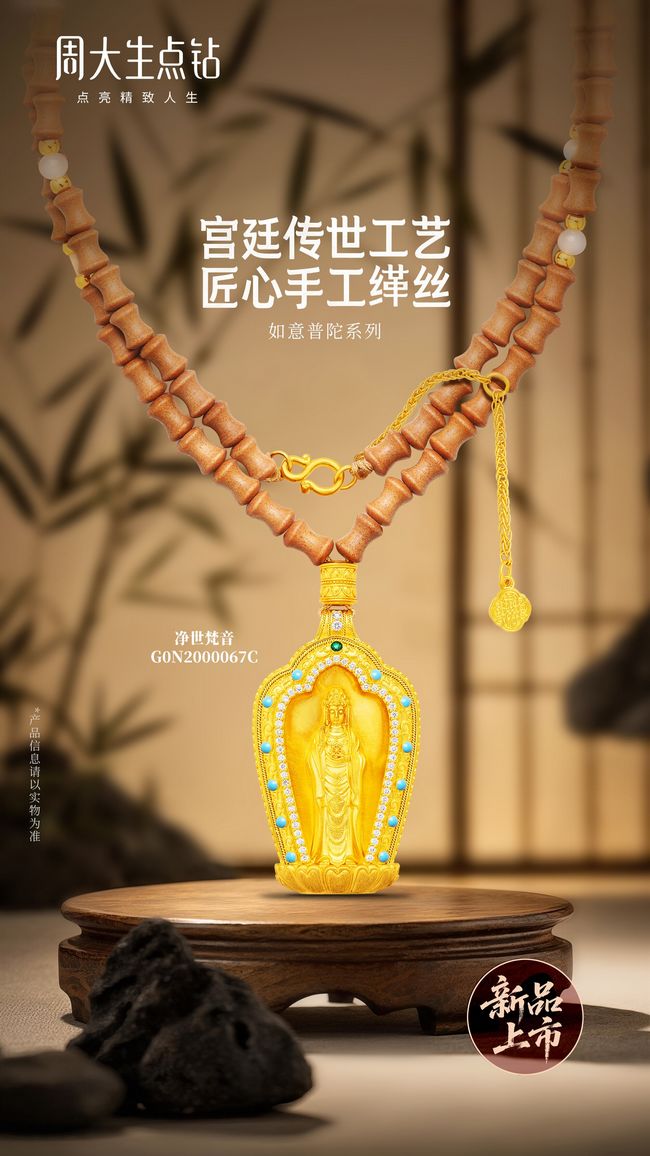 泰山之巍峨,凝聚众生的安宁祈愿;普陀之灵秀,寄托观音的慈悲恩泽;布达拉之神圣,承载雪域的虔诚信仰;国宝之珍贵,凝聚文明的古老回声。山川孕秀,宫阙含福,文物传声,诉往昔烟雨,承文脉绵长。周大生珠宝以自然灵韵与人文福韵为设计灵感,匠心打造的“吉祥四宝”新品,将山川宫阙之福,凝于方寸之间;让岁月文脉之美,尽显饰物之上,引领观者步入那壮丽山河与悠久历史交织的意境之中,于无声之处,彰显周大生的卓越匠心与深厚底蕴。