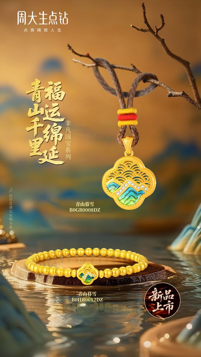 江山美如画,福韵耀古今。北宋《千里江山图》中起伏的峰峦与辽阔的湖面交相辉映、如锦似绣,寓意福泽绵延、万古长青。周大生点钻·福韵国宝系列以《千里江山图》的大美气象为设计灵感,融合青绿珐琅与点钻工艺,将画中层峦叠嶂、碧水青天的意境巧妙融入“青山暮雪”之中。青绿珐琅描绘的青山如此多娇,令人仿佛置身于画境之中。点钻如晨星闪烁,闪耀间流转千年风华。“青山暮雪”承载国宝的恢弘气韵,为佩戴者带来福运绵长、幸福美满的美好祝愿。