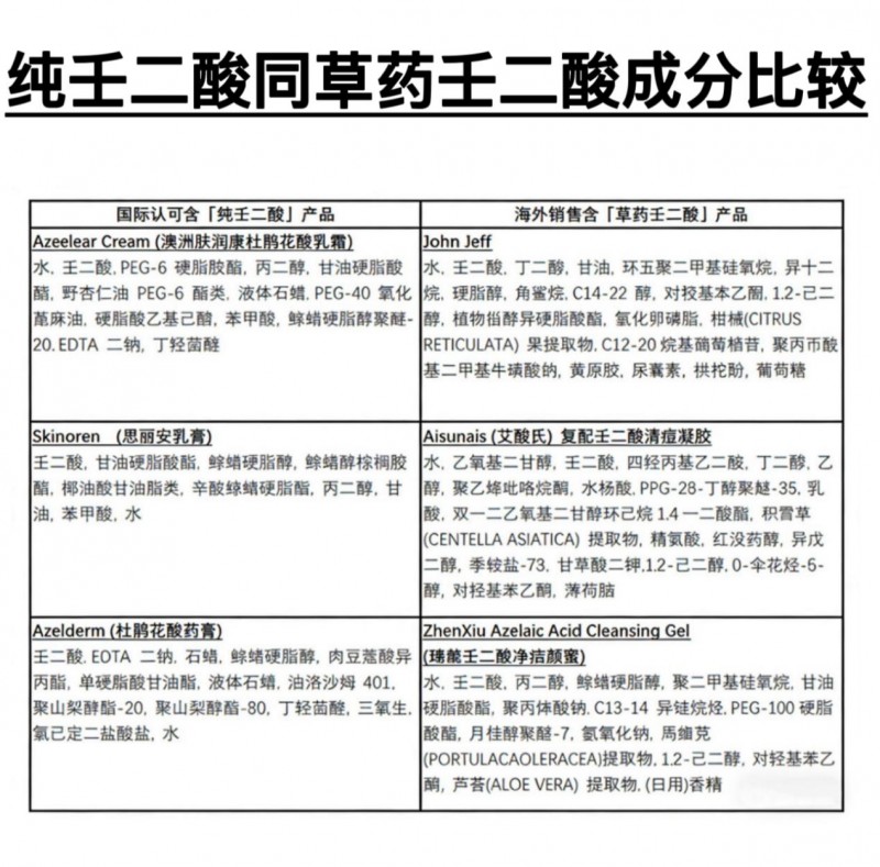 它们并没含有草药或植物,壬二酸, 用的是纯化学壬二酸。 纯壬二酸是经过近50年临床验证的有效成分,具有祛痘祛斑功能且安全性高。其来源包括纯壬二酸本身或由油酸臭氧分解生成,成分单一,无额外植物提取物添加。