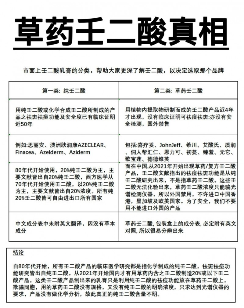 近期多人在谈论壬二酸的真假,市面上充斥着冒充纯壬二酸产品的草药壬二酸, 這類「假壬二酸」产品是从植物中提取草药壬二酸而造成, 而草药壬二酸因没有临床验证证明能祛痘祛斑,在国外禁售的,只要你比较一下真壬二酸产品同草药壬二酸的成分便知道。